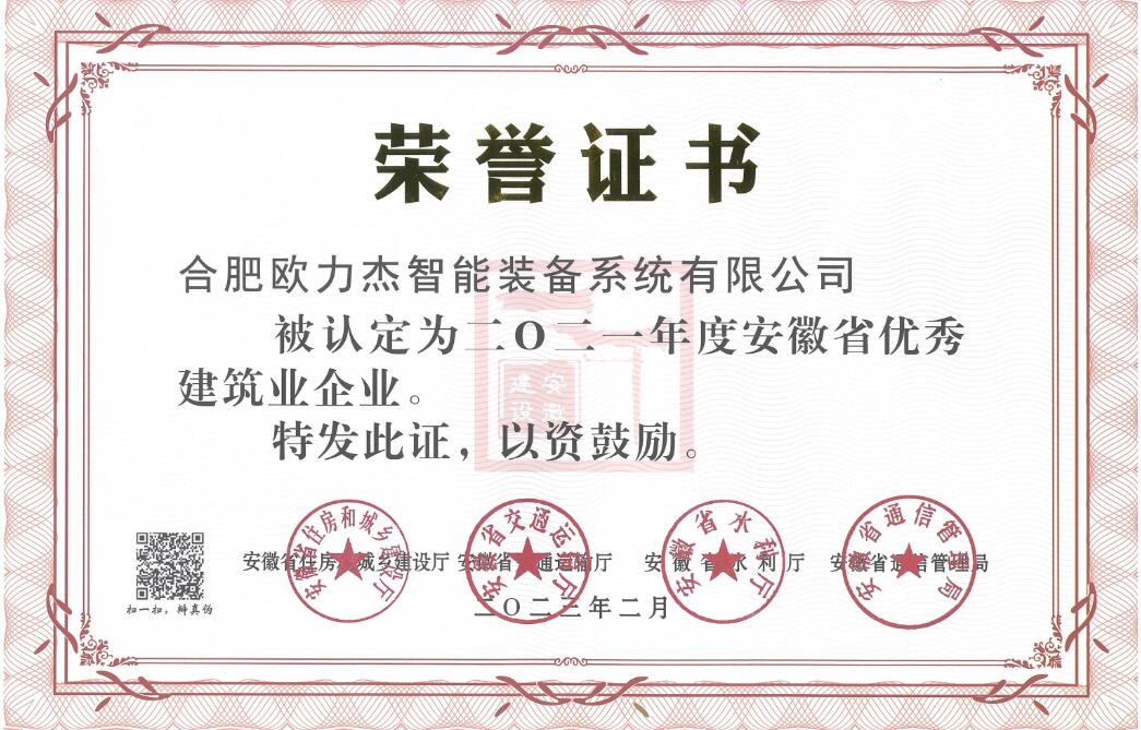 熱烈祝賀合肥歐力杰智能裝備系統(tǒng)有限公司榮獲2021年度安徽省優(yōu)秀建筑業(yè)企業(yè)。該榮譽(yù)由安徽省住房和建設(shè)廳、安徽省交通運(yùn)輸廳、安徽省水利廳、安徽省通訊管理局四部門于2023年2月統(tǒng)一評選認(rèn)定。
